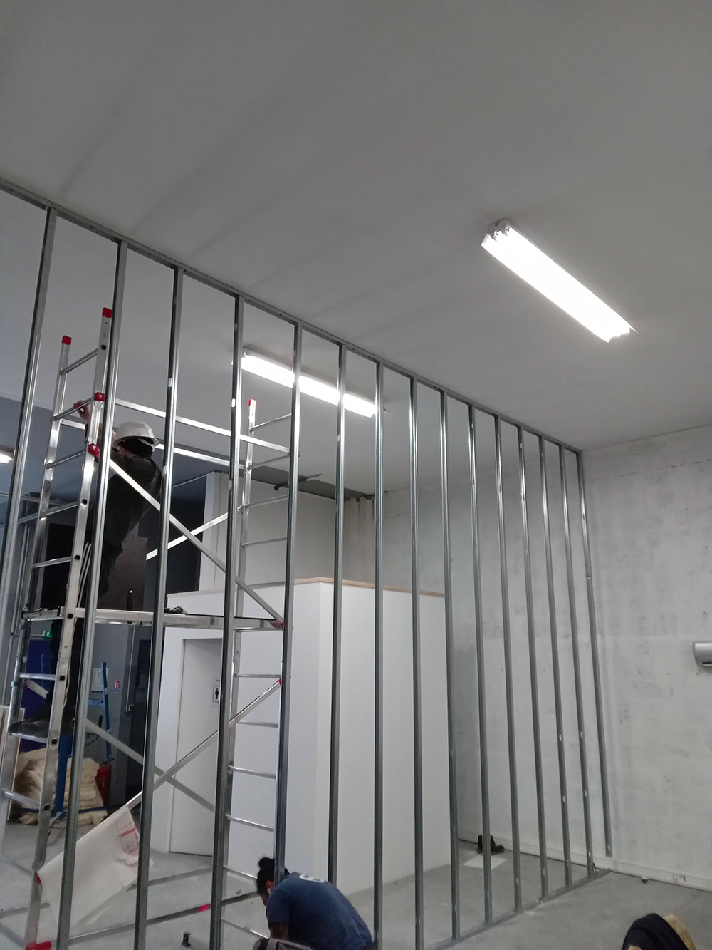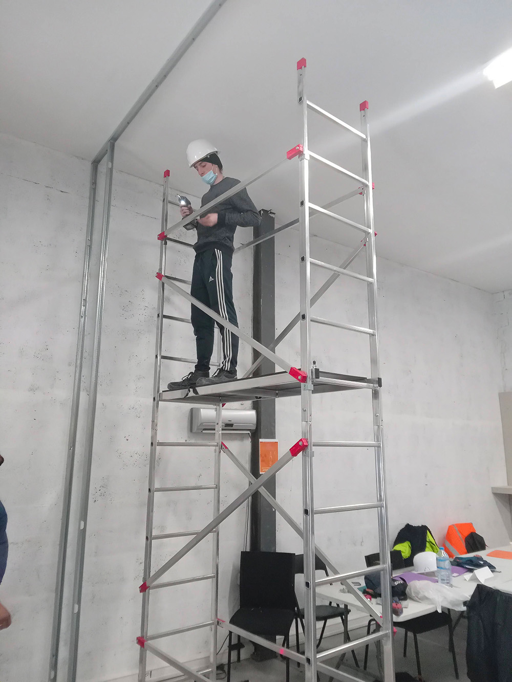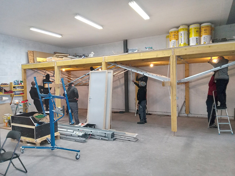 Atelier pratique : maquettes grandeur réelle, postes de travail équipés (ossatures métalliques, plaques de plâtre, isolants…).