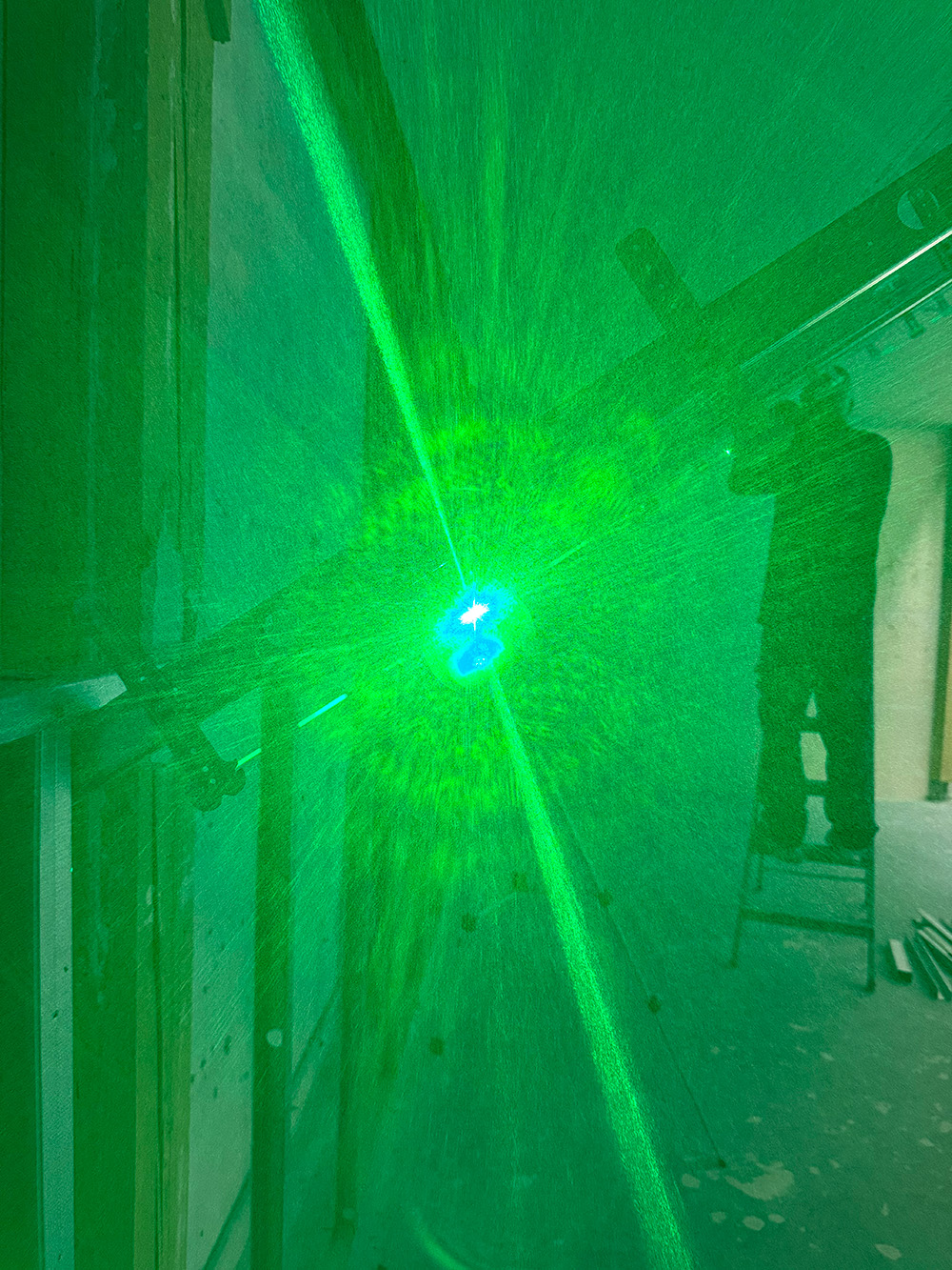 Outils professionnels : visseuses, niveaux laser, cutter, scies à plaques, règles de maçon, cordeaux à tracer.